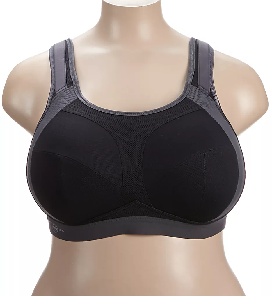 Soft sports bra is designed with ventilated, powerful, supportive fabrics that separate full breasts and reduce movement. Made of polyester, nylon, and elastane.