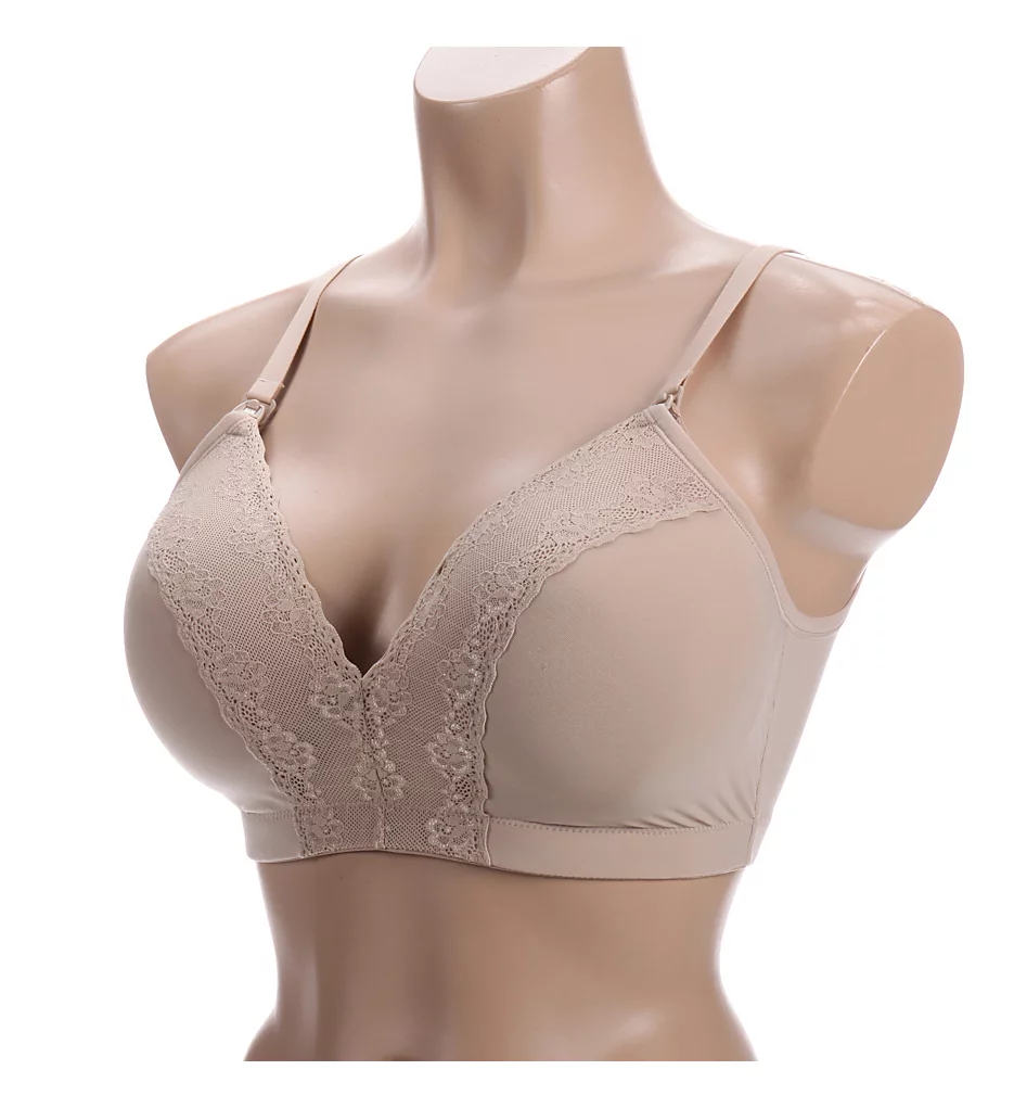 Blissfully comfortable bra supports you and helps holds breast in place for easier nursing, and all without wires! Body is made of nylon/spandex with cotton/Lycra spandex sling.