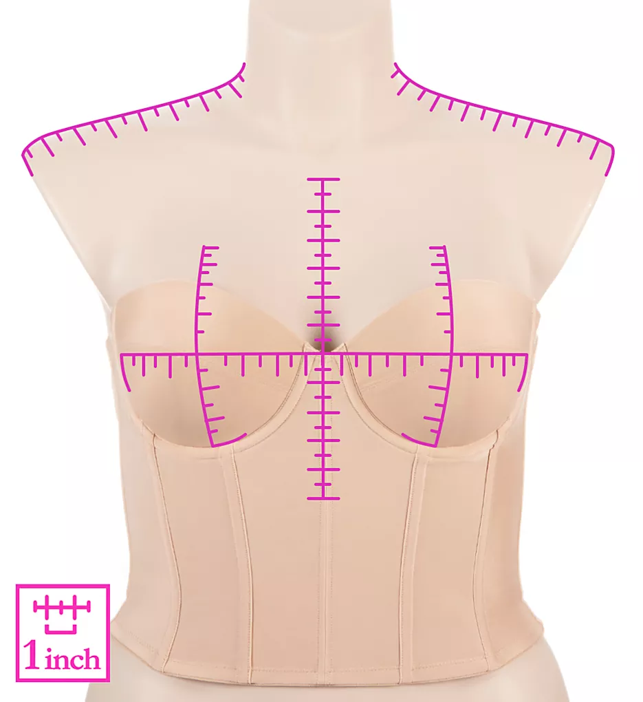 - Long flexible boning provides supportive structure and a smooth surface at center, below underwires, and at sides.