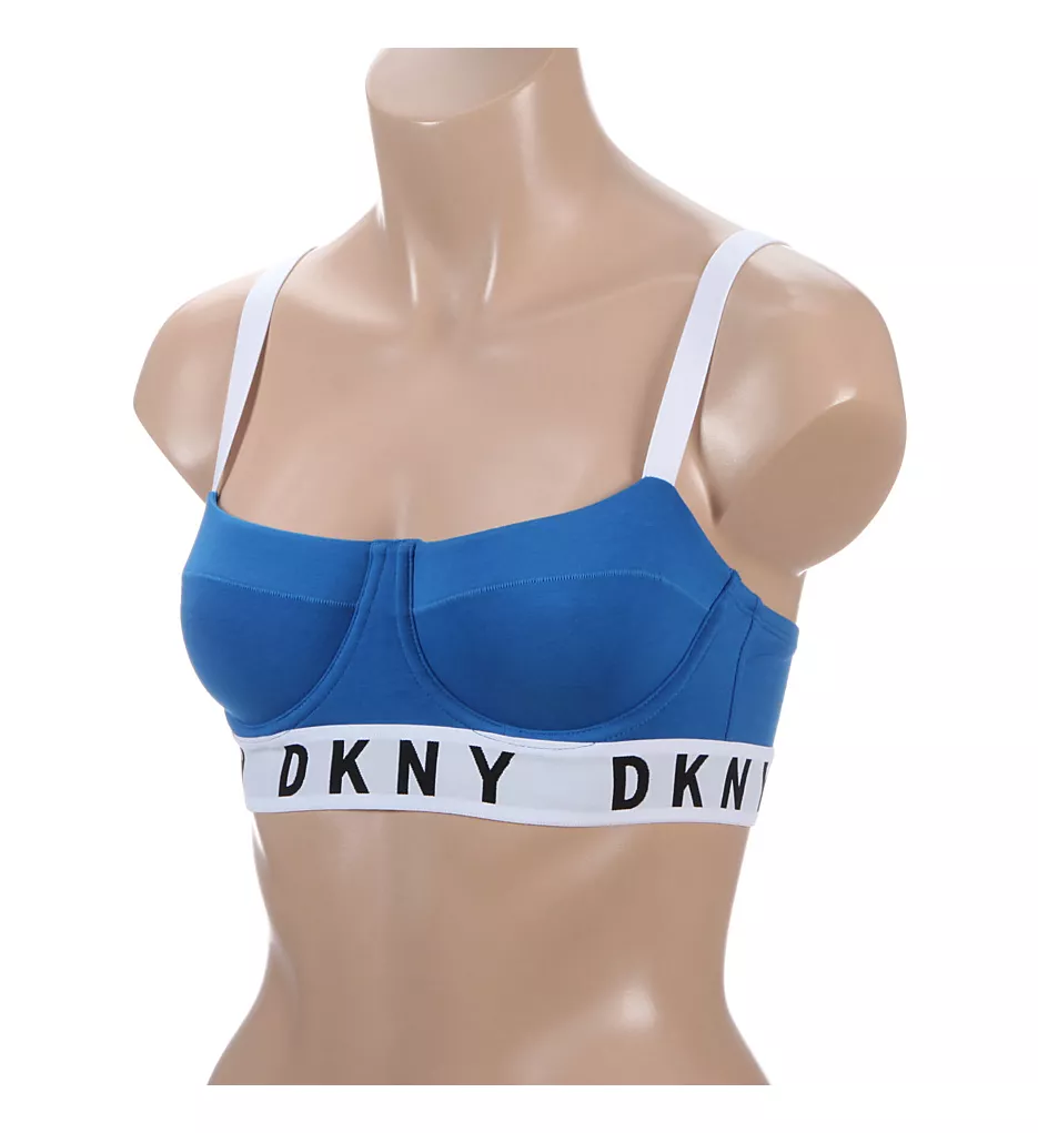 - Underband of wide, exposed elastic with the repeating knitted DKNY label.