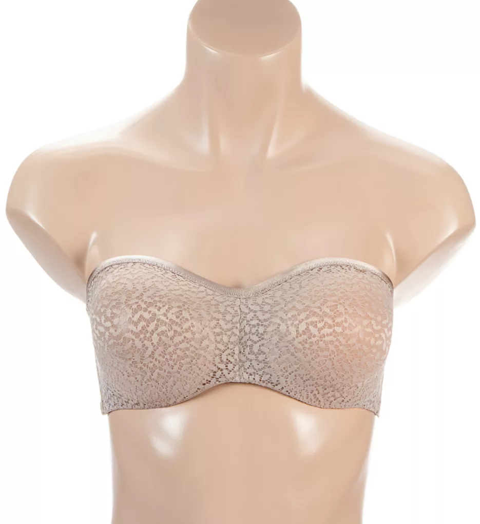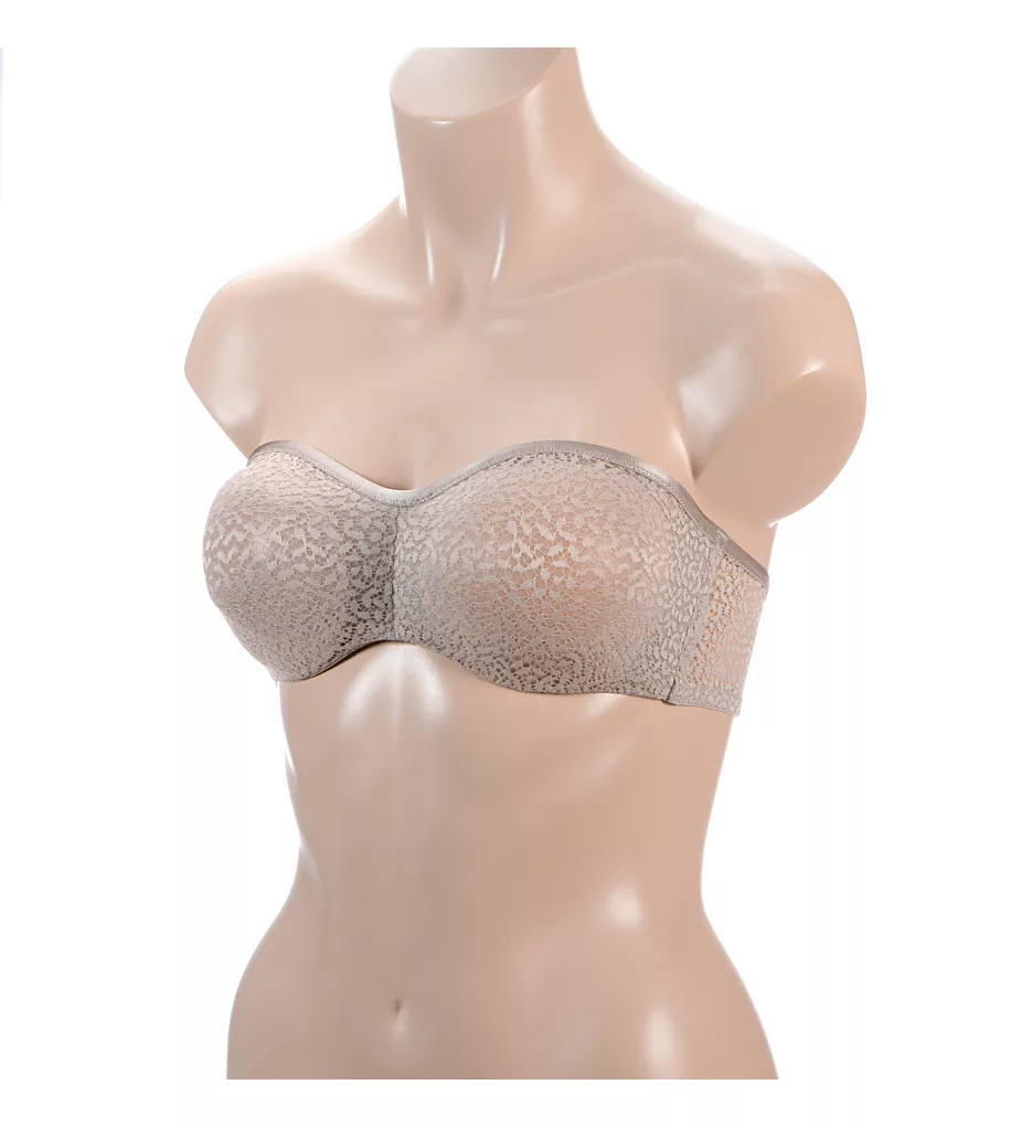 Elegant lace bandeau bra features silicone gripper elastic and supportive boning. Made of nylon and spandex.