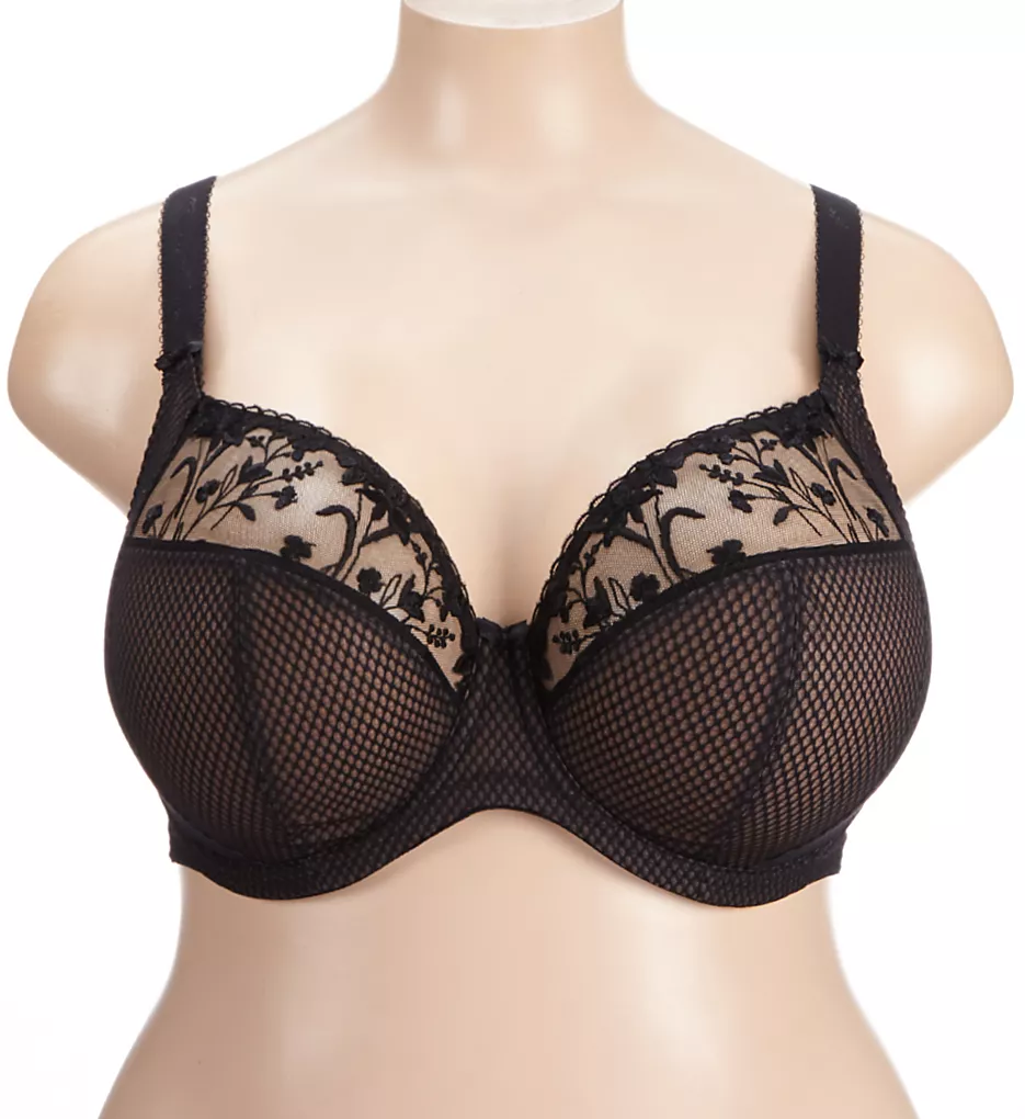 - Sheer mesh upper cup features multicolor (or tonal black) embroidery and a sewn-on elastic edge for fit.