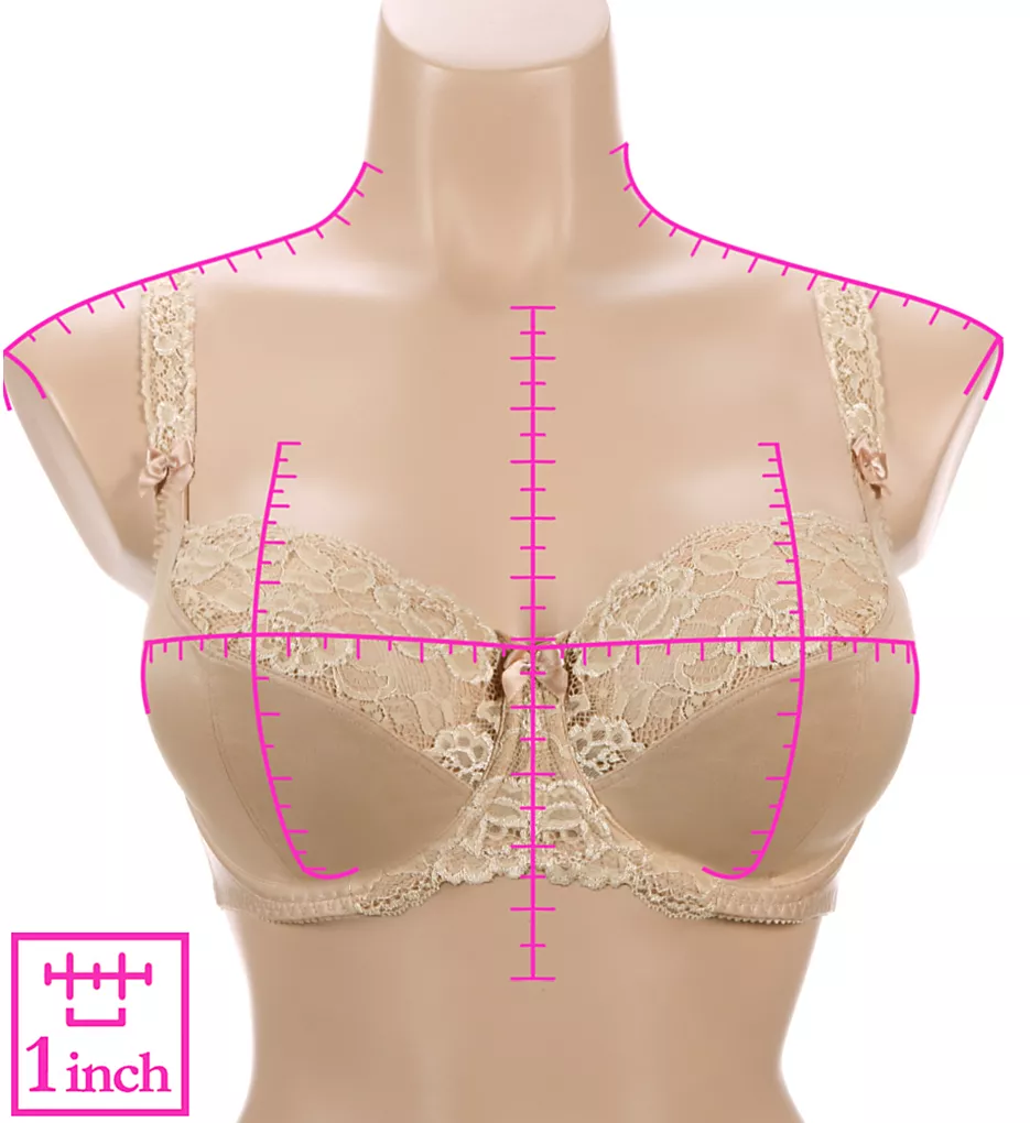 - French lace adorns the top of the cups, the center panel and the front of the shoulder straps.