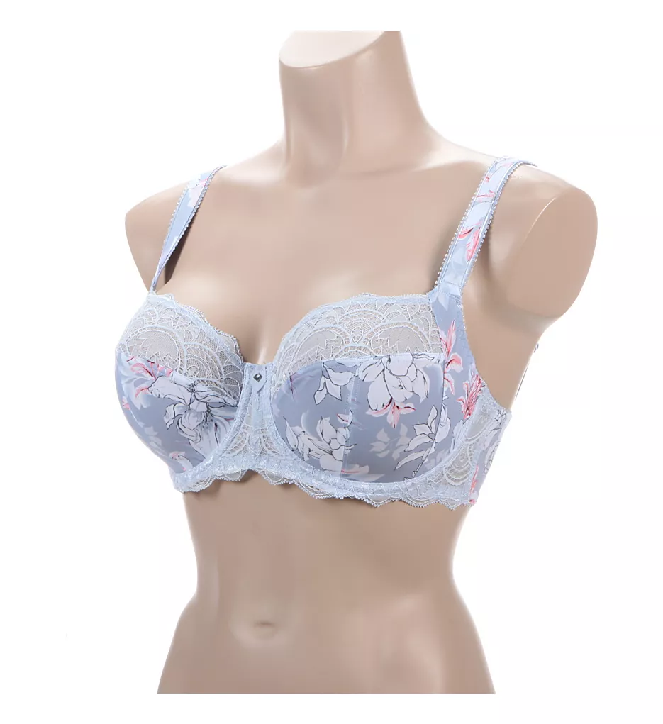 Gorgeous pastel bra with a pretty white floral print has a light feel, with powermesh sides and restricted stretch straps for support. Made of polyester, nylon and elastane.