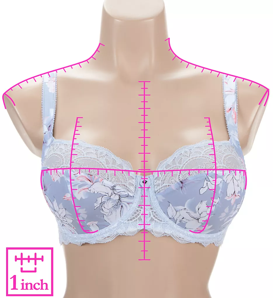 - Multipart underwire cup is unlined (unpadded), with light woven floral print at bottom for comfort, consistent shape and support.