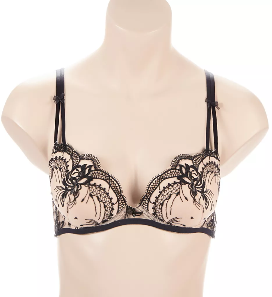 A gorgeous padded cup bra in a seductive nude shade with fabulous femme fatale black embroidery from cups to sides. Made of polyurethane, polyester, polyamide, and elastane.