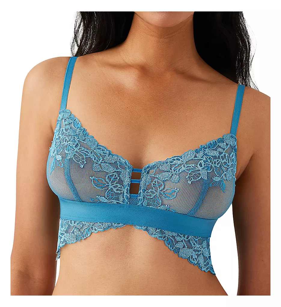 Sensuous lace bralette has embroidered flowers for an ultra feminine look. Made of nylon and spandex.