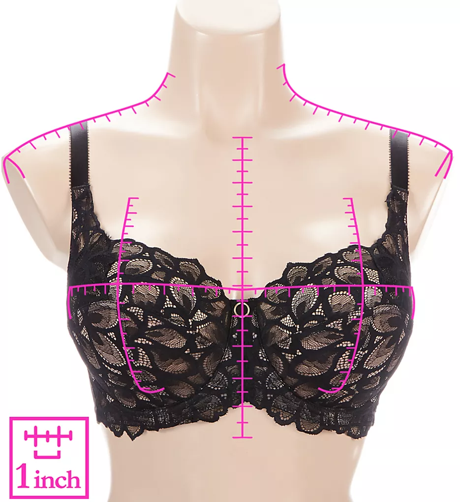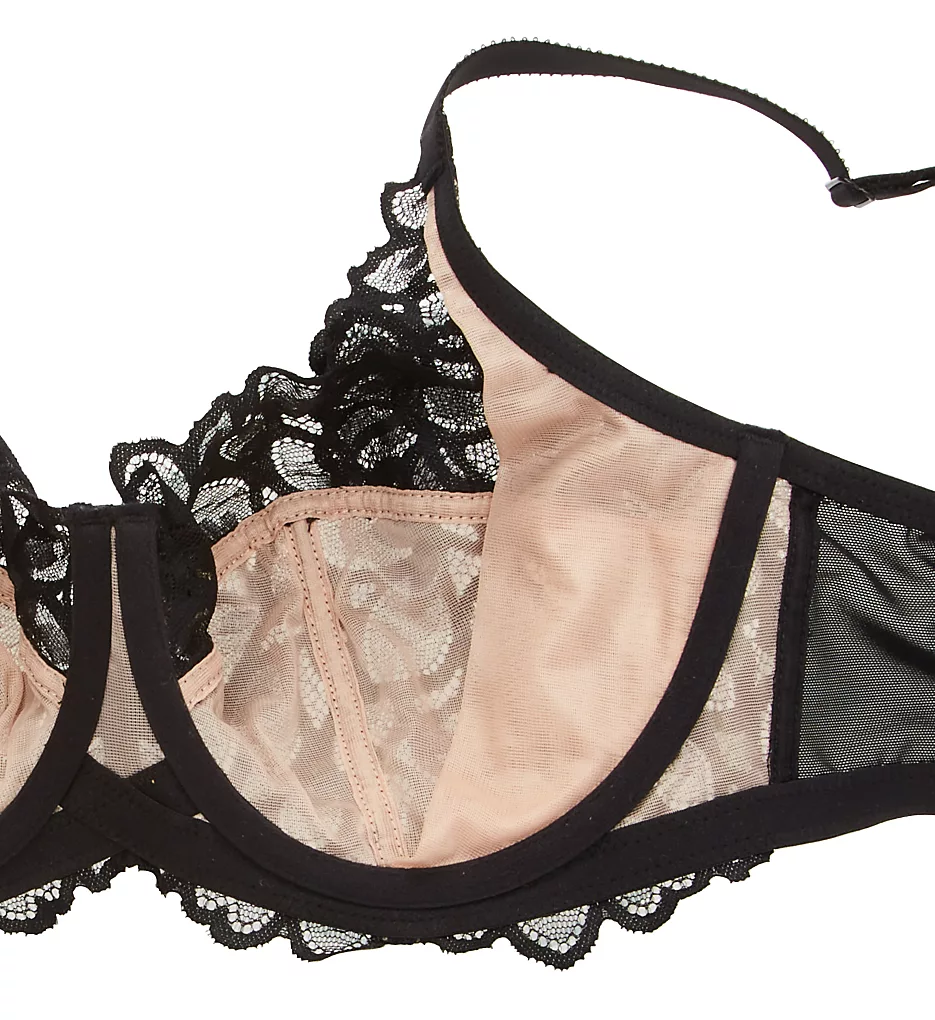- Multipart underwire cup has mesh lining along the bottom and a side support sling for extra lift and coverage.