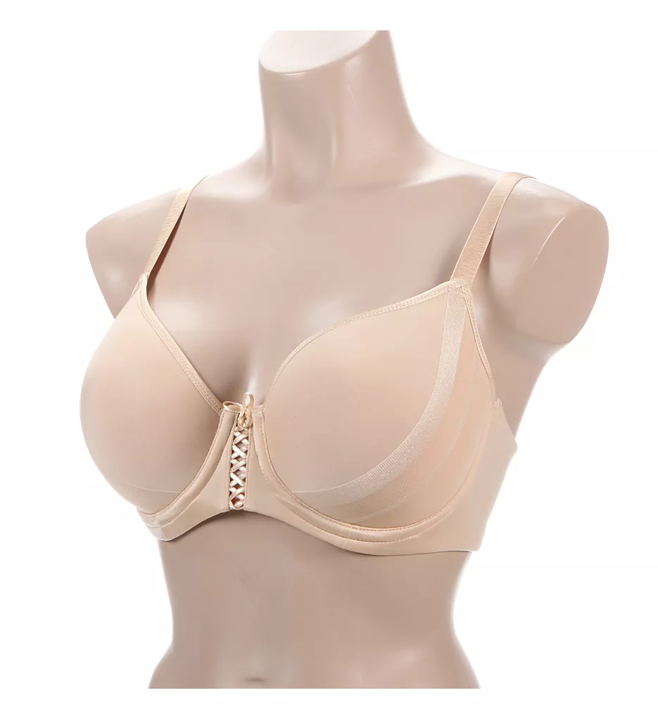 T-shirt bra has chic laced-up accent at center panel and mesh cup overlay with shimmery bands. Underwire cups have breathable spacer foam padding and side support slings, so you stay supported and comfortable all day! Made of polyamide and elastane.