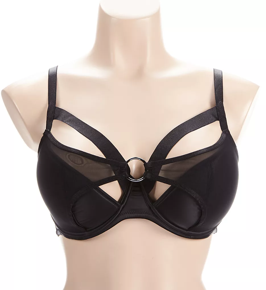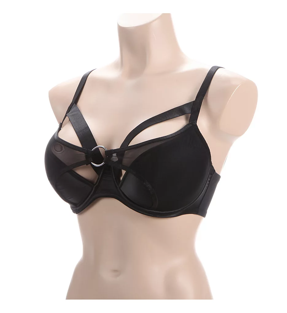 - Sheer mesh bands run over cup and attach to metal ring at center front.
