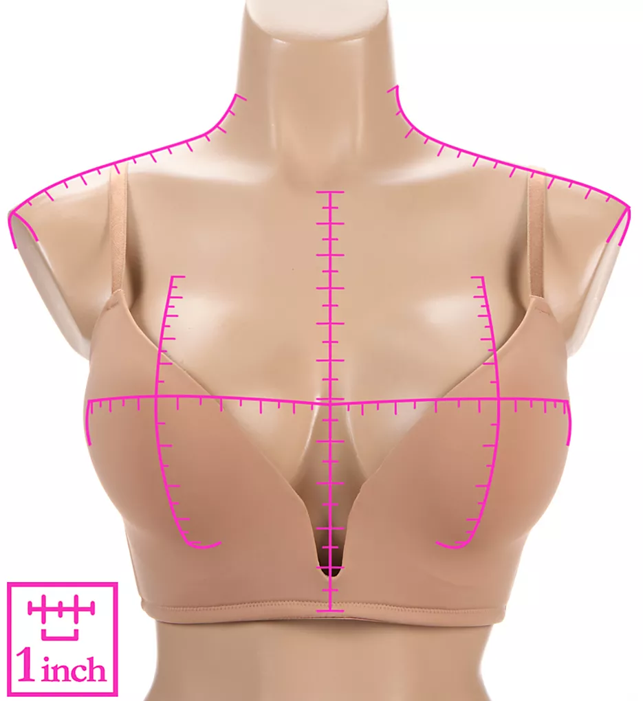 - Cup is 3/16″ thick, and tapers from 9/16″ thick with removable push-up pads inserted for up to DD cup sizes.