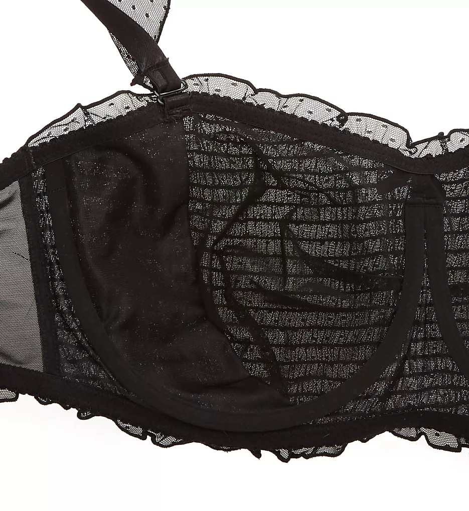 - Convertible style may be worn as a strapless bandeau, with detachable, wide-set straps and/or an extra pair of straps with a sheer, dotted ruffle that may be worn on or off shoulders.