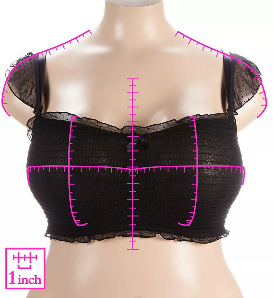 - Top and bottom edges are trimmed with ruffled, point d’esprit dotted sheer mesh that matches strap ruffles.