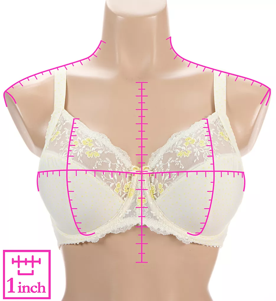 - Wide sheer mesh panel is set into top of cup with pretty floral embroidery.