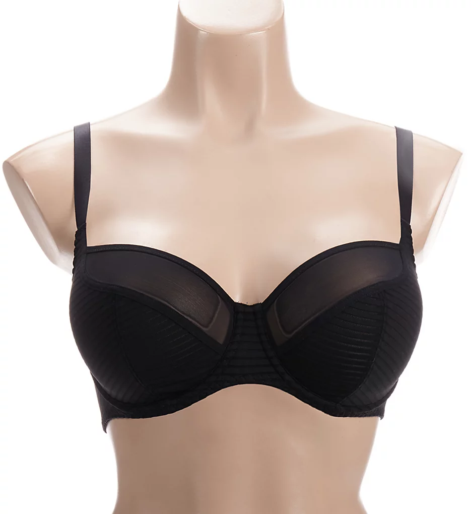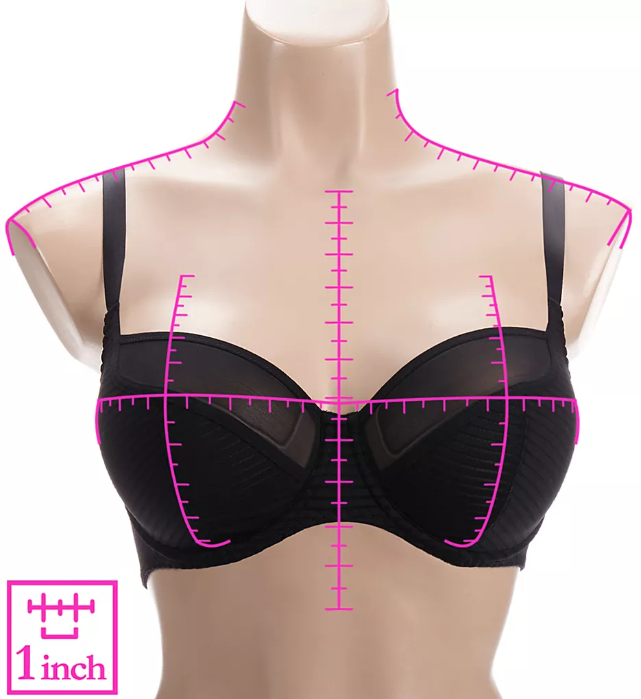 - Multi-part underwire cup has angled and vertical seams and is lined with fine mesh below angled seam.