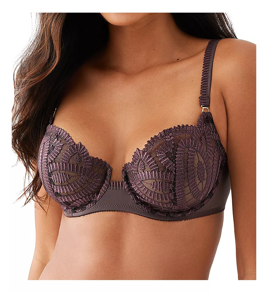 - Sheer multipart underwire cup is unlined non-stretch tulle with extensive embroidery and a vertical seam.