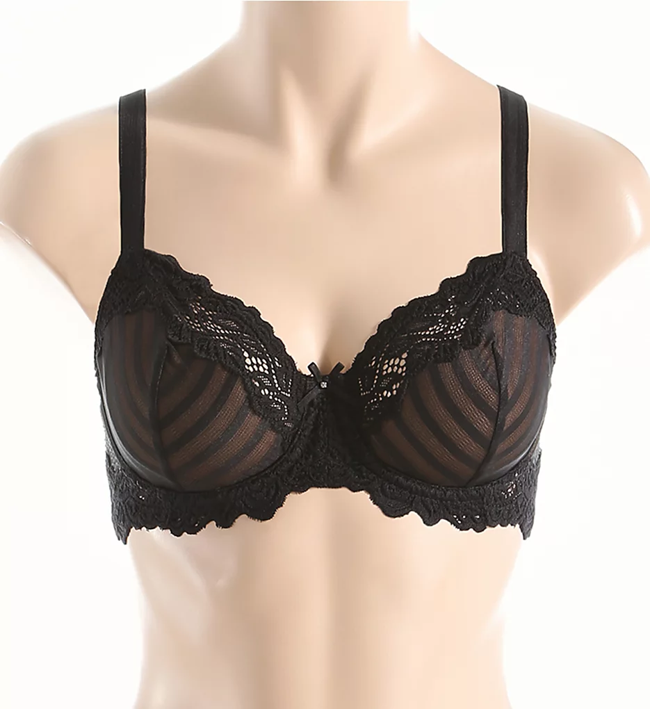 - Multi-part, unpadded underwire cup is see-through striped lace with angled and vertical seams for shape and fine mesh lining for reduced show-through.